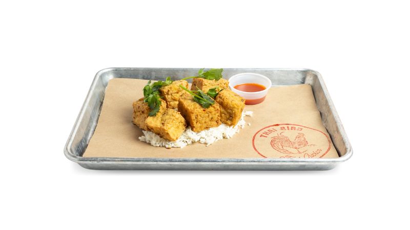 Fresh made tofu with lemongrass, jasmine rice, and Thai-style sriracha served on the side.